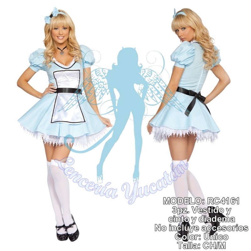 3 piezas. Disfraz de Alicia, incluye vestido, cinto negro y diadema. No incluye accesorios.